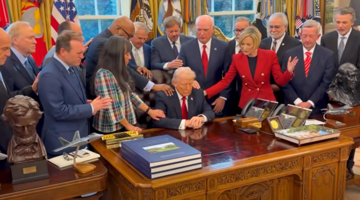 In recent years, Trump has also posed for many photo ops in which evangelical Christian leaders pray for him with hands on his body like they’re performing a magic trick. But that trick rests on the assumption that Trump is accepting their prayers because he believes the same nonsense.