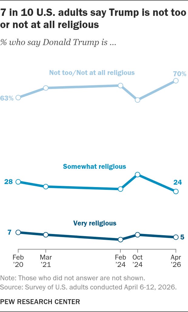 70% of Americans say Donald Trump is not religious, according to new polling from the Pew Research Center.
