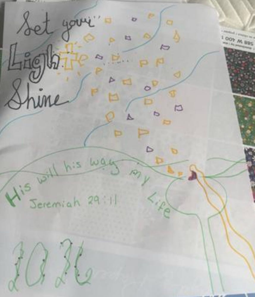 This one included their compromise. It said “let your light shine,” with the “T” in “light” being a Christian cross, as the administrators suggested. It also included the phrase “His will his way my Life” and referenced Jeremiah 29:11. So… basically everything the school said she could do.