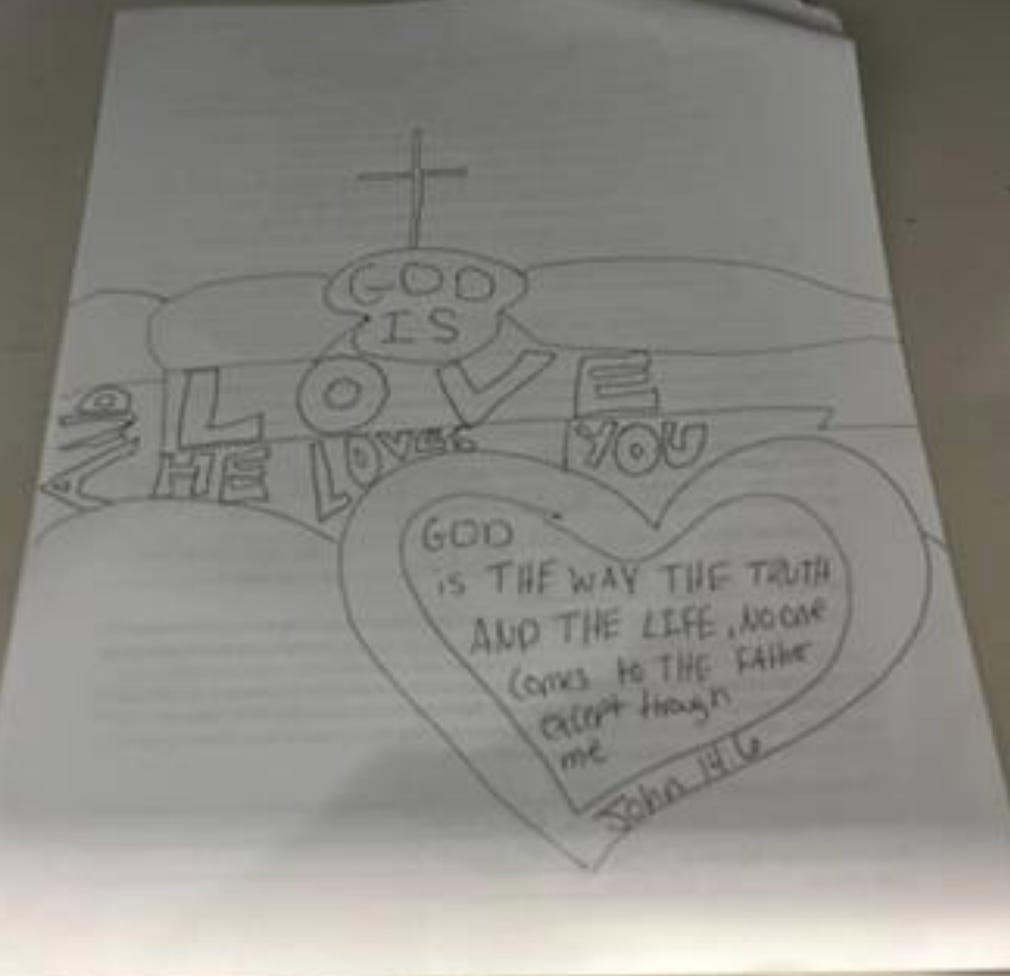 Last May, one of those upcoming seniors, Sabrina Steffans, submitted her sketch: It included a Christian cross, the phrases “God is love” and “He loves you” and the text of a Bible verse (John 14:6). It made sense given that she’s the president of a Christian club at the school.