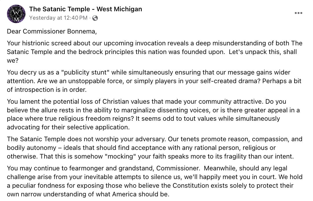 On Friday, the Satanists responded to Bonnema with a post of their own, calmly explaining why Bonnema was completely full of shit.
