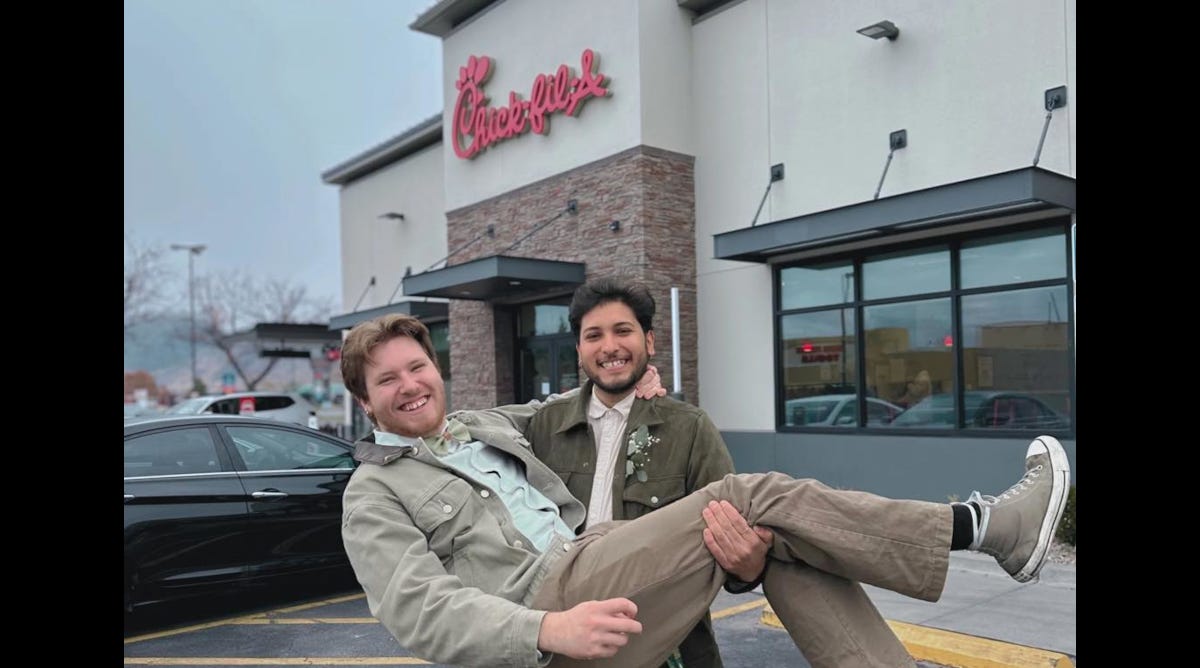 Were Dougie & Toby regular customers? Did they know that Chick-fil-A has a notoriously anti-LGBTQ history including a former CEO who said in 2012 that the company supports “the biblical definition of the family unit”? Who knows. But the post went viral because