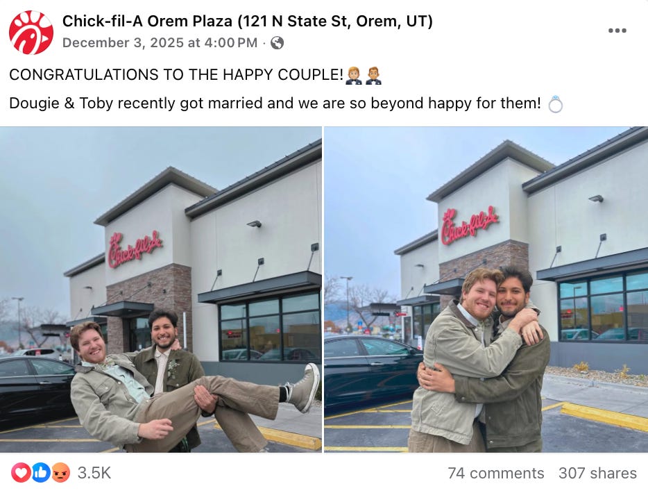 A single Chick-fil-A store congratulated a gay couple, and conservatives lost their damn minds