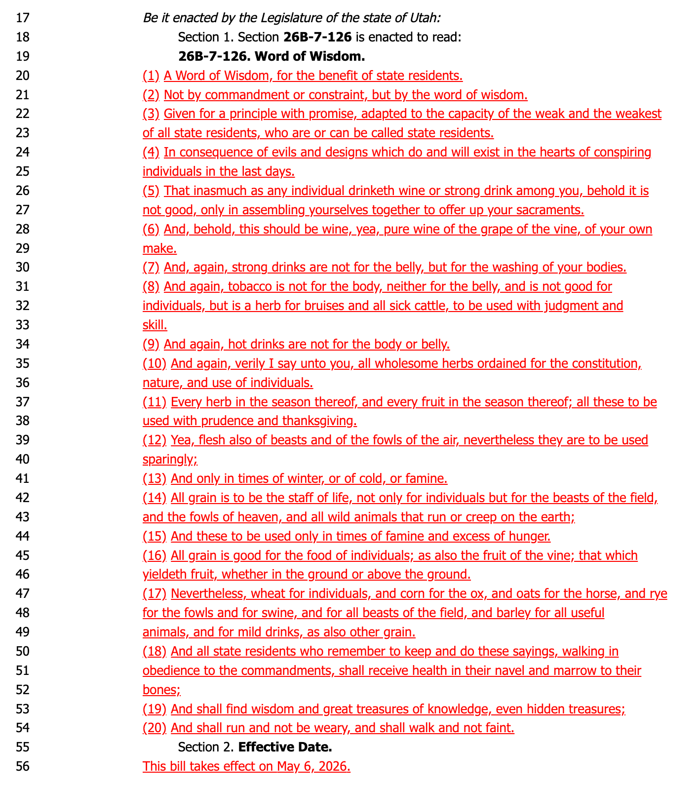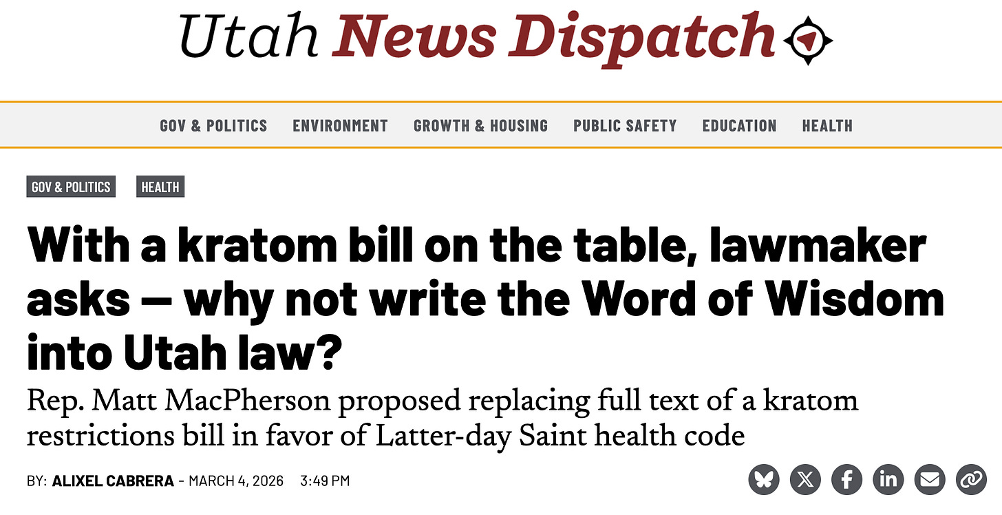 What struck me as interesting about this whole conversation is that much of the media—not to mention Reddit threads—didn’t seem to understand the point MacPherson was trying to make. Numerous headlines, like the ones I mentioned earlier, made no reference to his sarcasm, using phrases like “LDS Word of Wisdom introduced in debate over Utah’s kratom ban,” “With a kratom bill on the table, lawmaker asks—why not write the Word of Wisdom into Utah law?,” and “Utah lawmaker attempts to put ‘Word of Wisdom’ in state code.”