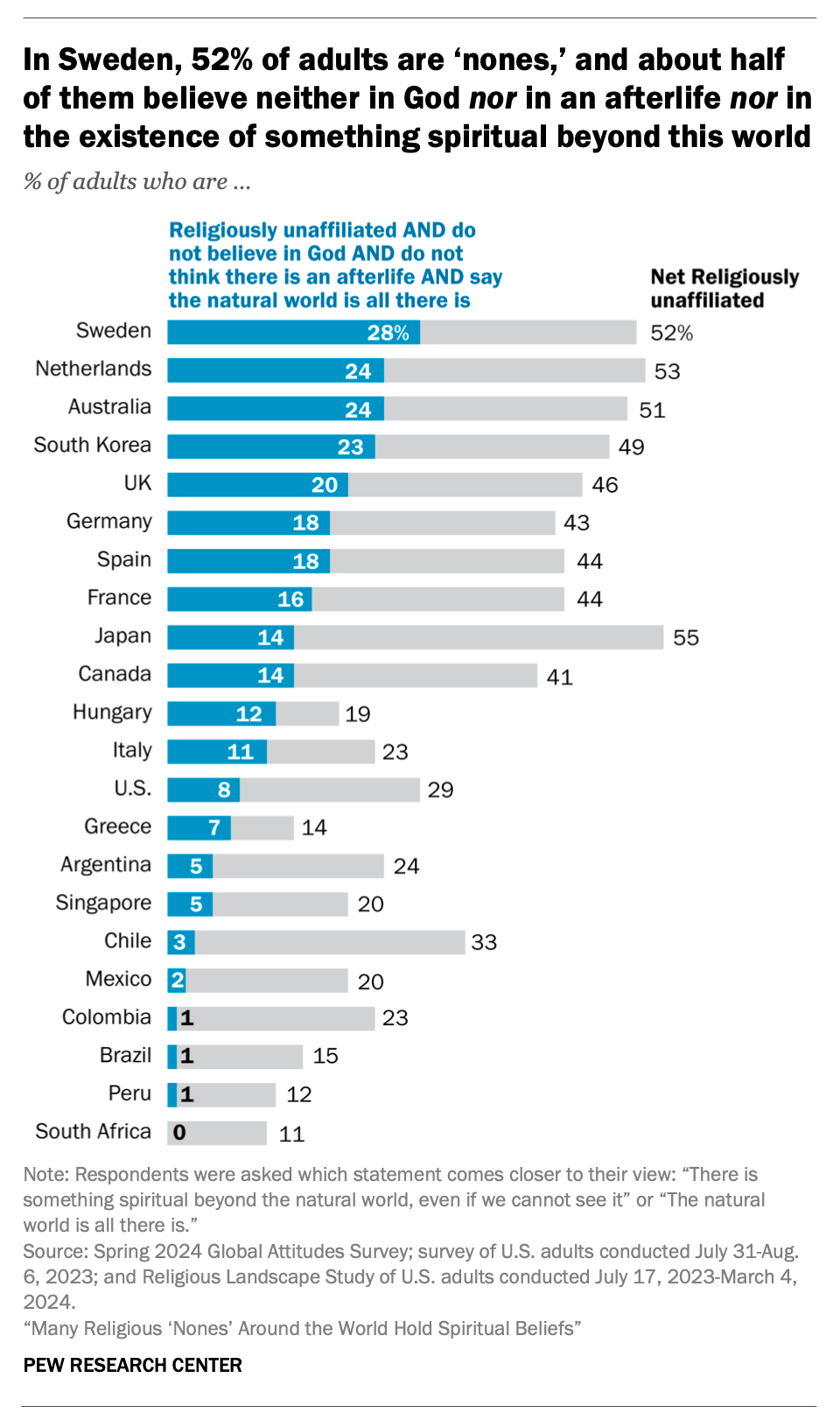 And that puts us waaaaay down in the pack compared to other countries. In Sweden, where 52% of people are Nones, more than half of them (28% of the country overall) don’t believe in all that supernatural nonsense.