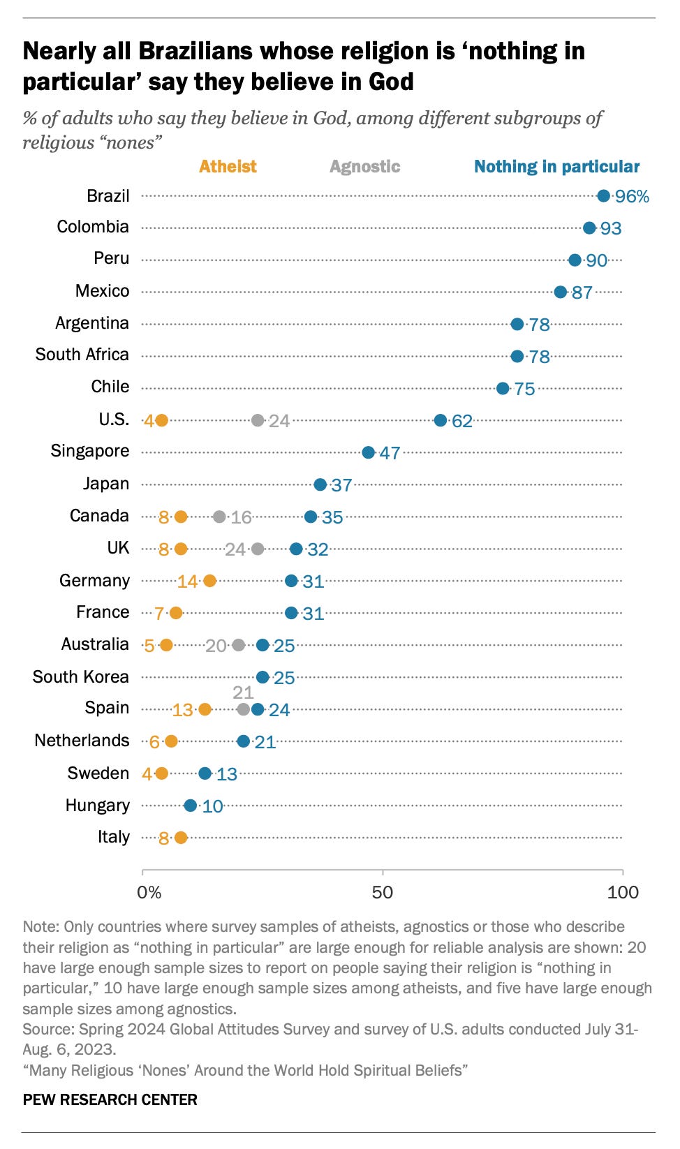 Here’s another fascinating result: In Brazil, Colombia, Peru, and Mexico, nearly all of their Nones believe in God. In the U.S., it depends on which subgroup you’re looking at. (Weirdly, 4% of U.S. atheists say they believe in God, which just shows you logical consistency isn’t universal.)