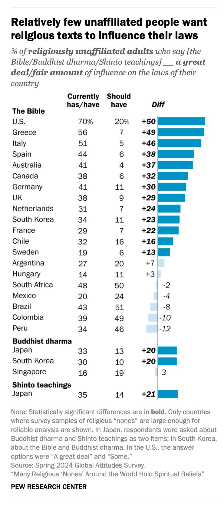 Here’s another difference between the countries: In America, 70% of Nones say the Bible has a lot of influence on the laws of our nation. (It absolutely does. That percentage should be higher.) But 20% of Nones say the Bible should have a lot of influence on our laws. The gap between those two thoughts is the largest among the nations surveyed with similar questions. That makes some sense when you consider how much damage Christian Nationalism is doing to our country—no wonder people want to see far less Christian influence in our politics.