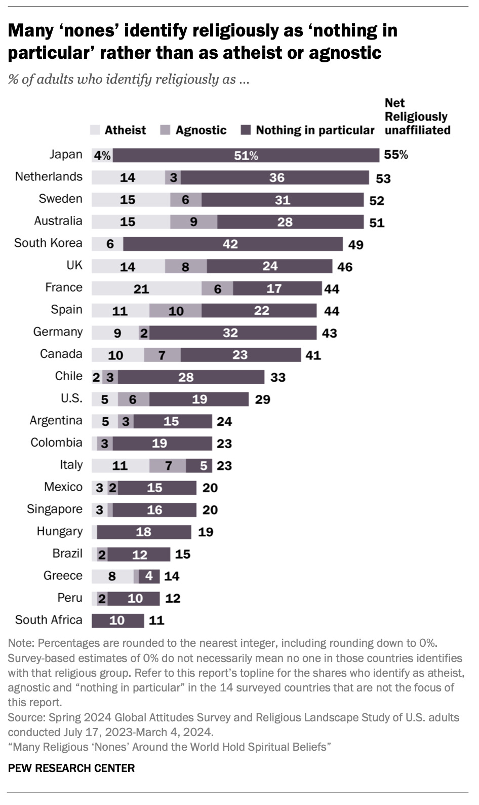 In France, 21% of the country is atheist, and that makes up about half of their Nones. Meanwhile, in Japan, 55% of people are Nones but a mere 4% are atheists.