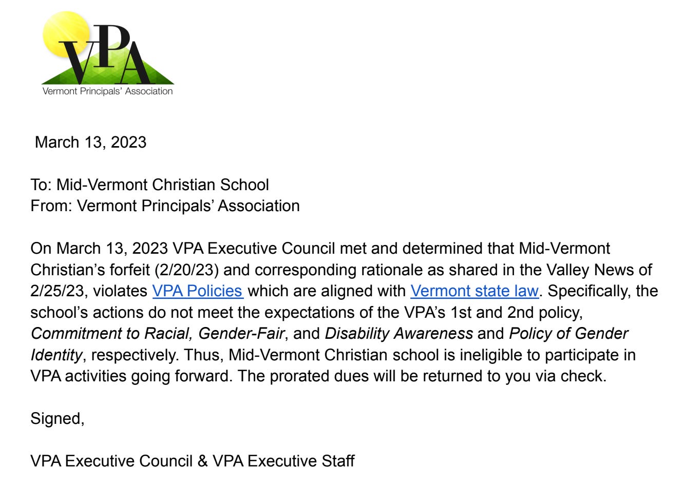 Two weeks later, though, they made it official: Mid Vermont Christian School would no longer be allowed to participate in VPA-sponsored athletic events.