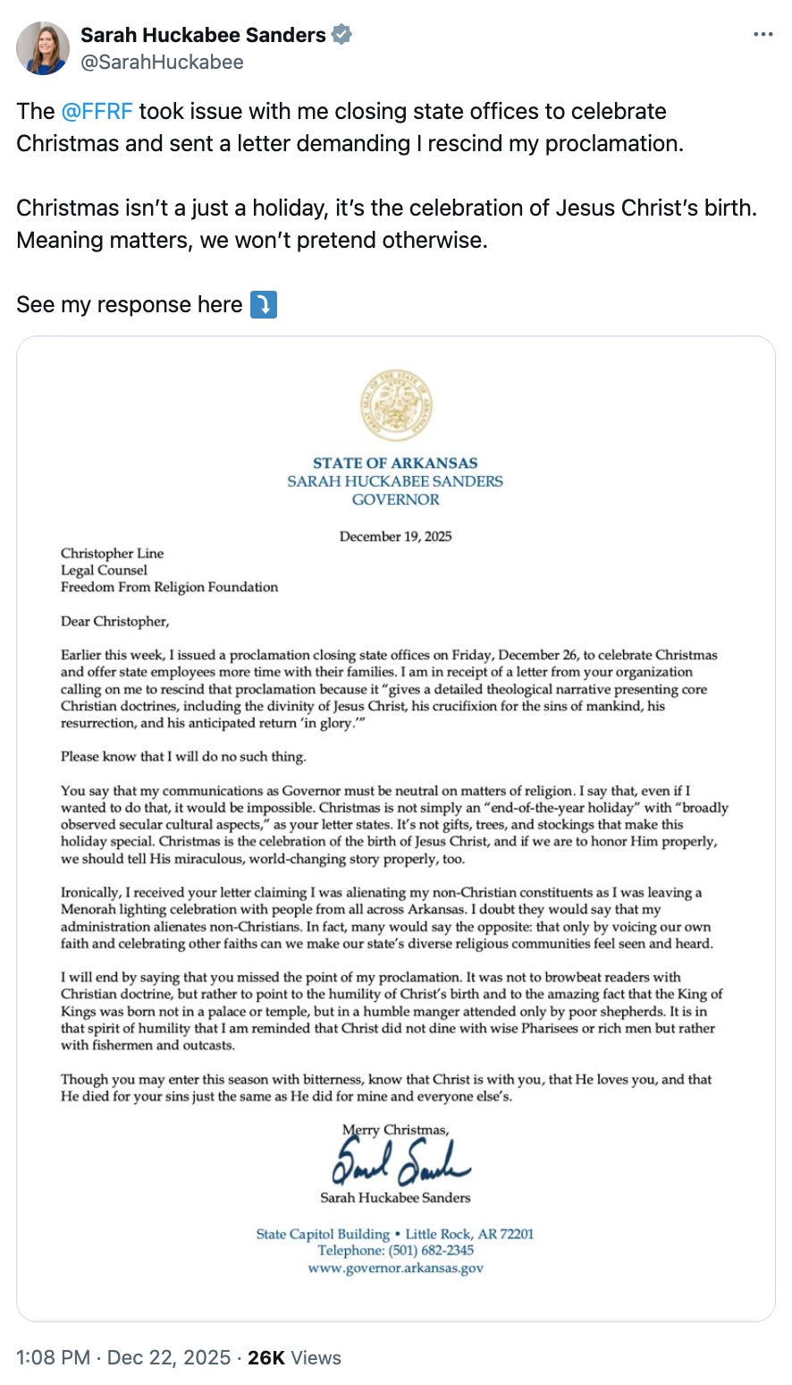 Huckabee-Sanders got elected on name recognition and precious little else. By all appearances she has lived in the fundamentalist bubble from birth. A few things worth pointing out. There is no definitive evidence Jesus ever even existed. No one knows who wrote the gospels, and there are no original copies of them. Although things are attributed to Jesus no one has any idea what he actually said, because he didn't write anything down. We know a lot about the Romans because they DID write things down. The Romans were pretty good map-makers by the standards of their age, and the town of Bethlehem doesn't appear on any of them. There is no record of the Romans ever having conducted a census that required people to return to their place of birth, because what would be the point. When I see the kind of condescending smugness coming from Huckabee-Sanders I'm left with little doubt as to how the world got this screwed up.