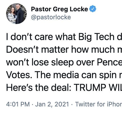 I’ve watched many long videos of the attack on the Capitol. I saw American flags. I saw Trump flags. I saw one Rebel flag. But I didn’t see any “Jesus Saves” flags or signs inside the Capitol. I saw them out on the Mall. And so I know there were Christians… Our goal is not to attack or to burn or to destroy. Our goal, as Christians, is to build up and to strengthen. And we want to build up America. We want to strengthen America.