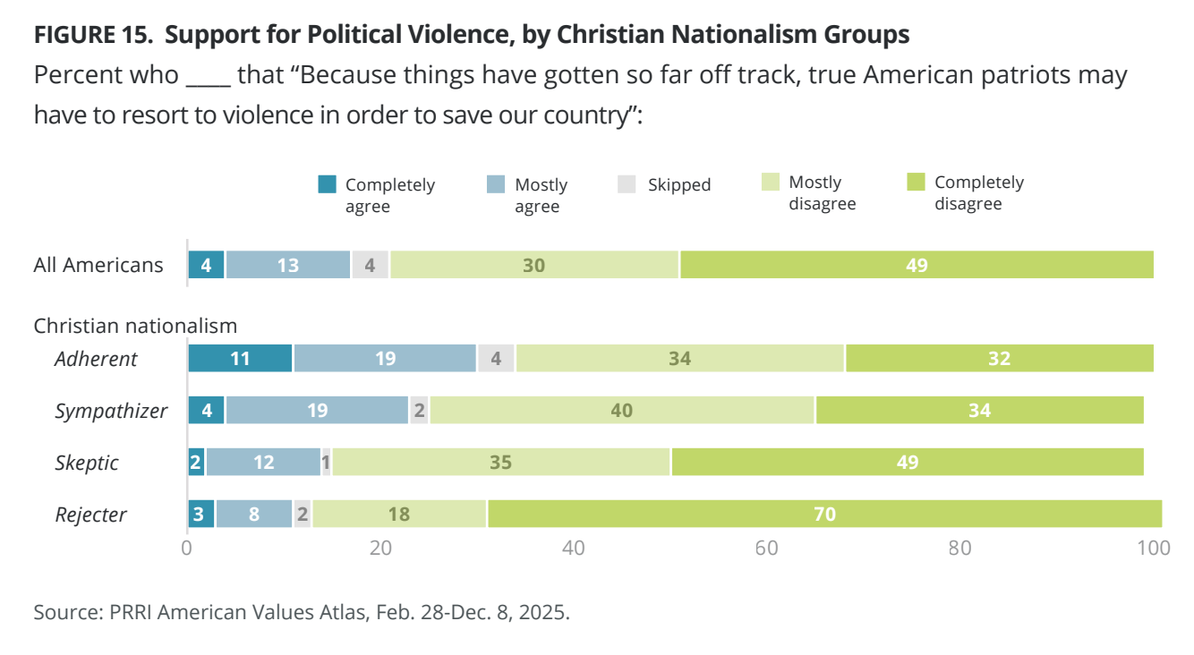 For one thing, those who support Christian Nationalism are also more likely to support political violence—30% of “adherents” say violence may be justified to “save our country”—which is disturbing in part because they’re much more susceptible to bad arguments. It wouldn’t take much to convince a Christian extremist that his country is being taken from him and the enemies are brown people, immigrants, and anyone perceived as an “other.” Hell, we just saw that play out in Minnesota. The Department of Defense is now practically a church with its own military and access to nuclear weapons.