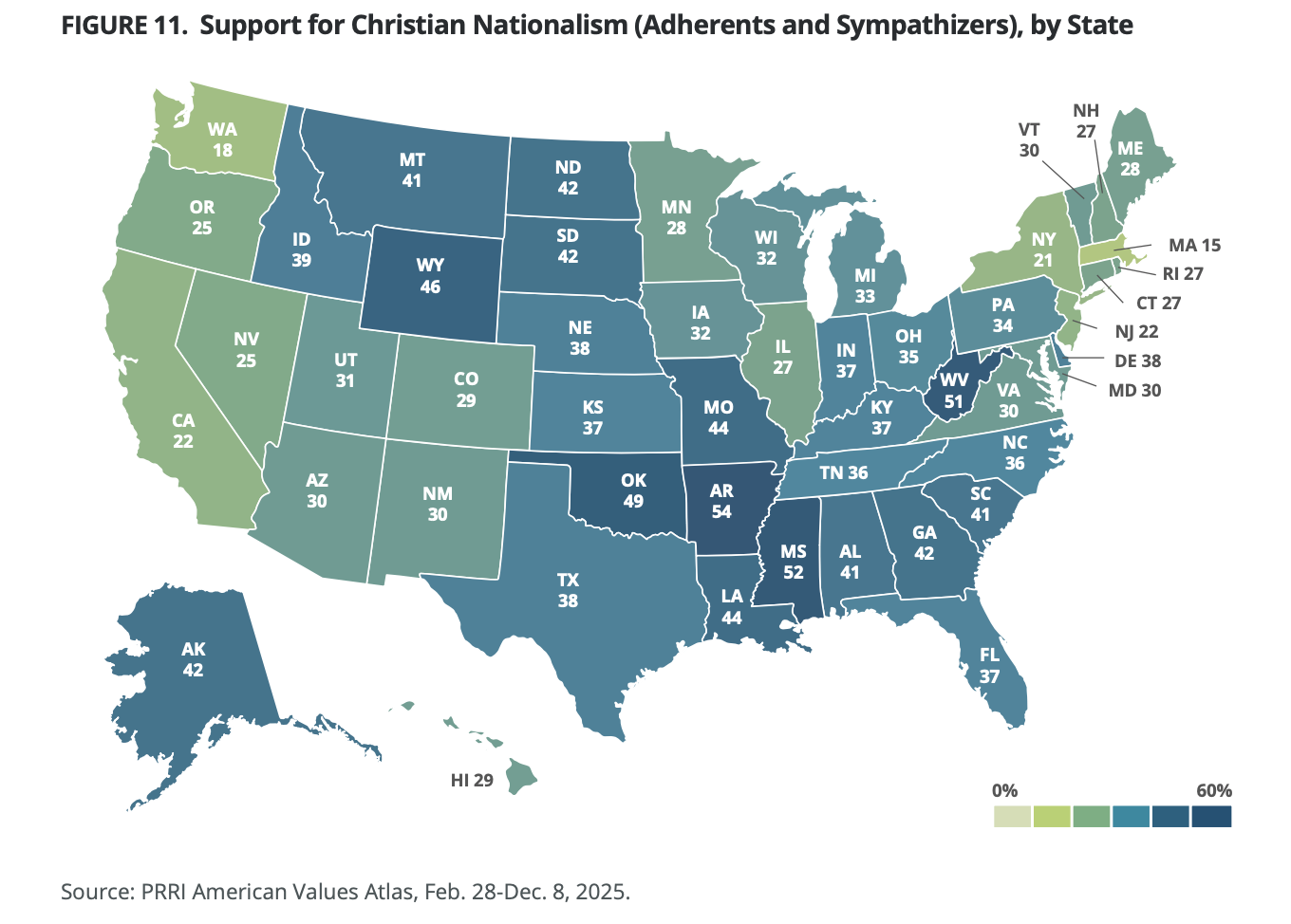 On the other end, Massachusetts wins the award for having the smallest proportion of Christian Nationalists, with only 15%.