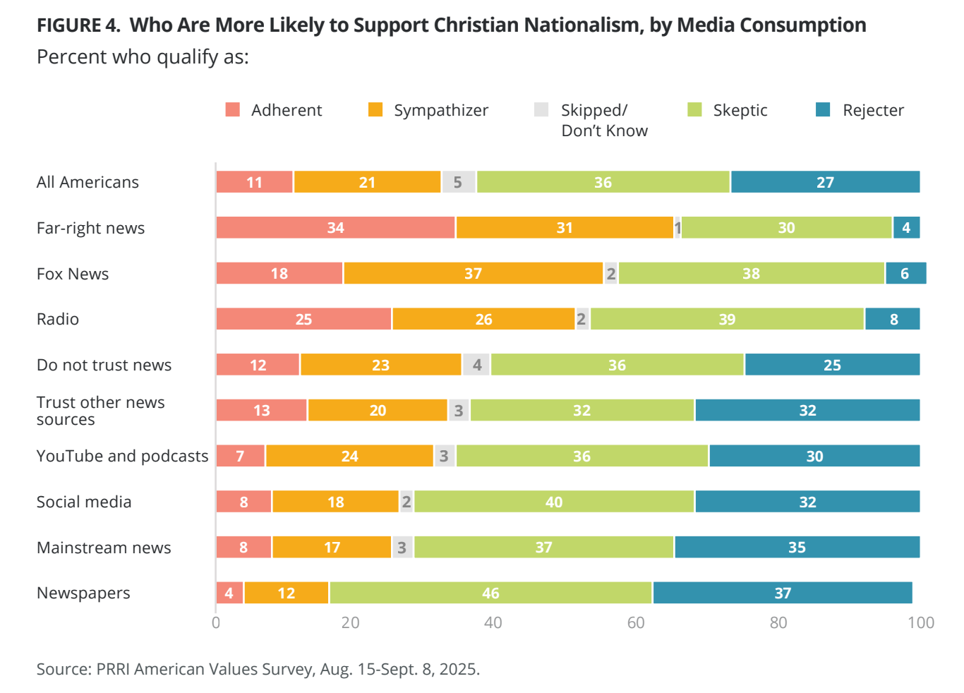 The percentages of Americans who support or reject Christian Nationalism have held relatively steady for the past few years. But because it’s becoming more possible to live in your own reality bubble, we can now see precisely where the extremism is fomenting. Among those who watch “far-right news,” 65% are Christian Nationalists, a number that’s 10% higher than those who only stick to Fox News. People who get their news from the radio—where it’s easy to find right-wing commentators—are far more likely to be Christian Nationalists than those who get their news from newspapers.