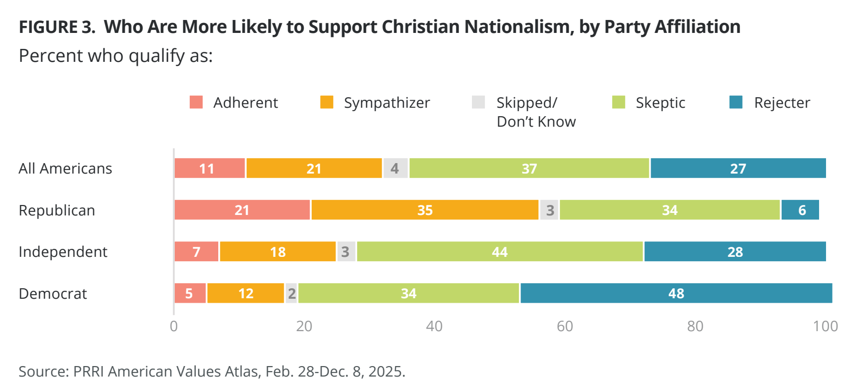 The Republican Party is rapidly becoming a Christian Nationalist organization, according to a new analysis from PRRI. The polling group found that while about one-third of Americans are “adherents” or “sympathizers” of Christian Nationalism, the number jumps to 56% among Republicans.