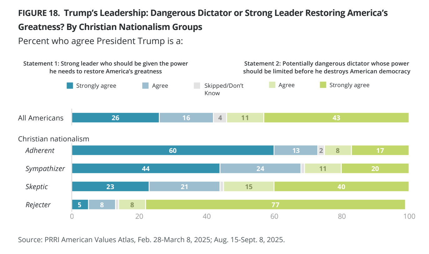 Those same “adherents” say they believe Trump should be allowed to act as a dictator, with 73% saying they agree that Trump is a “strong leader who should be given the power he needs to restore America’s greatness.”