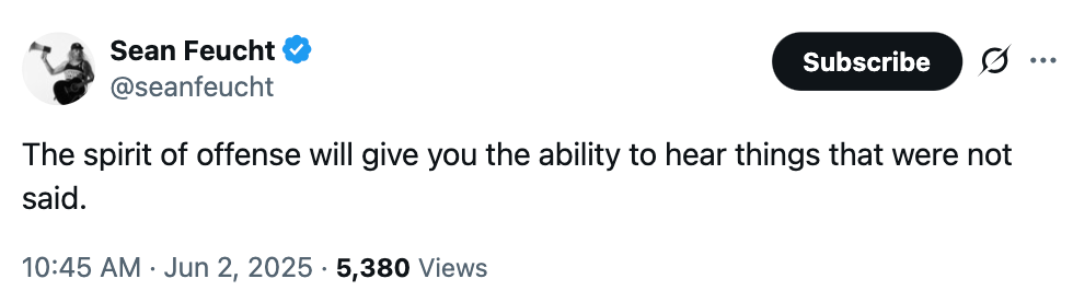 Feucht hasn’t formally responded to the website yet. But it’s not like he doesn’t know what it says. He’s perpetually online and tweeted over a dozen times yesterday, mostly trashing the very idea of Pride Month. It’s possible the following cryptic message was his response: “The spirit of offense will give you the ability to hear things that were not said.”