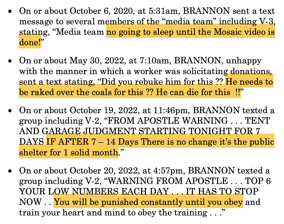 Among the text messages Brannon sent to the victims to force them to do her and Taylor’s bidding were ones like “He can die for this” and “You will be punished constantly until you obey and train your heart and mind to obey the training.”