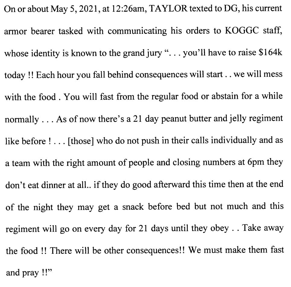 Armor bearers were Taylors’s personal servants who fulfilled Taylor’s demands around the clock. Taylor and Brannon controlled every aspect of the daily living of their victims. Victims slept in the call center facility or in a “ministry” house, and Taylor and Brannon did not permit them to leave without permission. Taylor demanded that his Armor Bearers transport women from ministry houses, airports, and other locations to Taylor’s location and ensured the women transported to Taylor took Plan B emergency contraceptives.