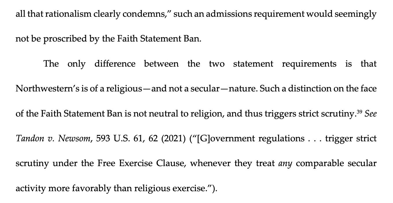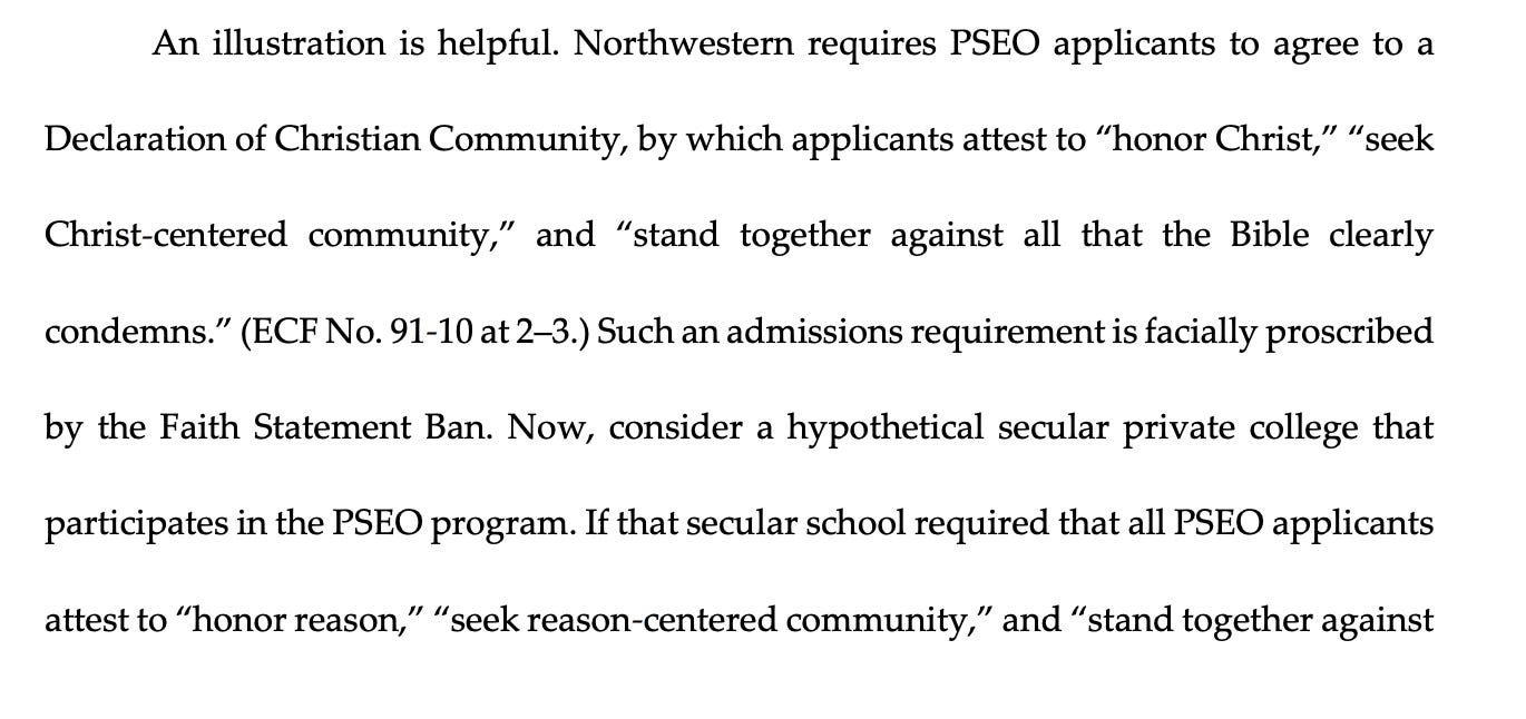 An illustration is helpful. Northwestern requires PSEO applicants to agree to a Declaration of Christian Community, by which applicants attest to “honor Christ,” “seek Christ‐centered community,” and “stand together against all that the Bible clearly condemns”… Such an admissions requirement is facially proscribed by the Faith Statement Ban. Now, consider a hypothetical secular private college that participates in the PSEO program. If that secular school required that all PSEO applicants attest to “honor reason,” “seek reason‐centered community,” and “stand together against all that rationalism clearly condemns,” such an admissions requirement would seemingly not be proscribed by the Faith Statement Ban.