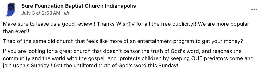 I’ll help them out. Yes. They agree. They all agree. That’s how these ideas get implanted in the oh-so-smooth brains of their members. In fact, on Thursday, the church was celebrating its new notoriety, writing on Facebook, “… Thanks WishTV for all the free publicity!! We are more popular than ever!!… If you are looking for a great church that doesn't censor the truth of God's word, and reaches the community and the world with the gospel, and protects children by keeping OUT predators come and join us this Sunday!!”