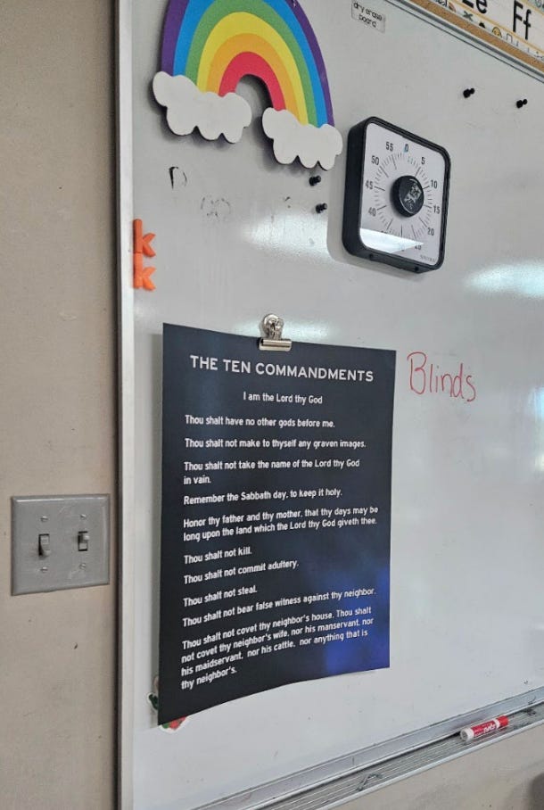 I’ve been writing about these attempts to shove Christianity into classrooms for a while now, but here’s the short version of what happened in Arkansas: Their law required every public school classroom to display a copy of the Ten Commandments. Those posters didn’t even need a disclaimer explaining the supposed historical relevance of the Decalogue.