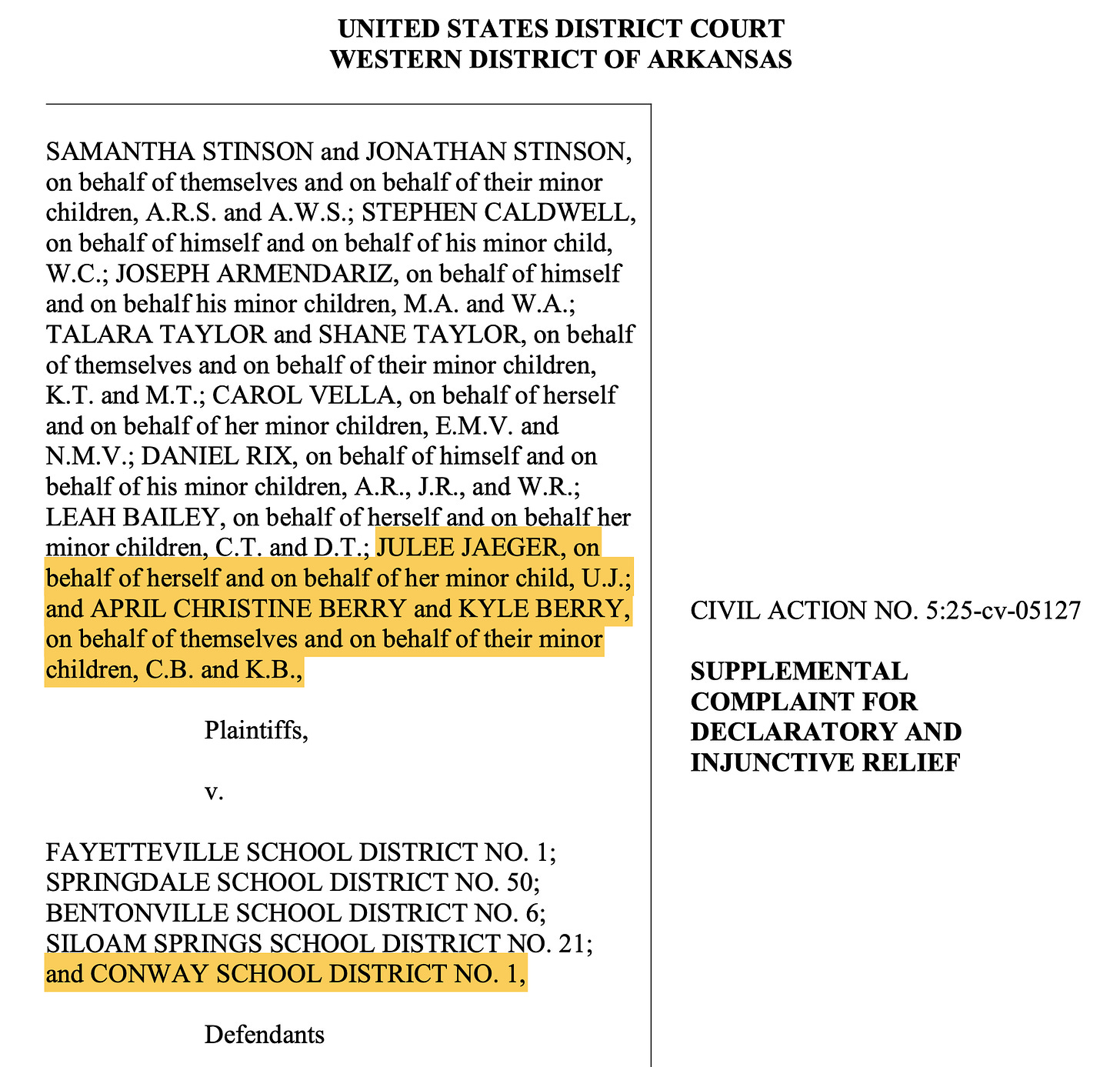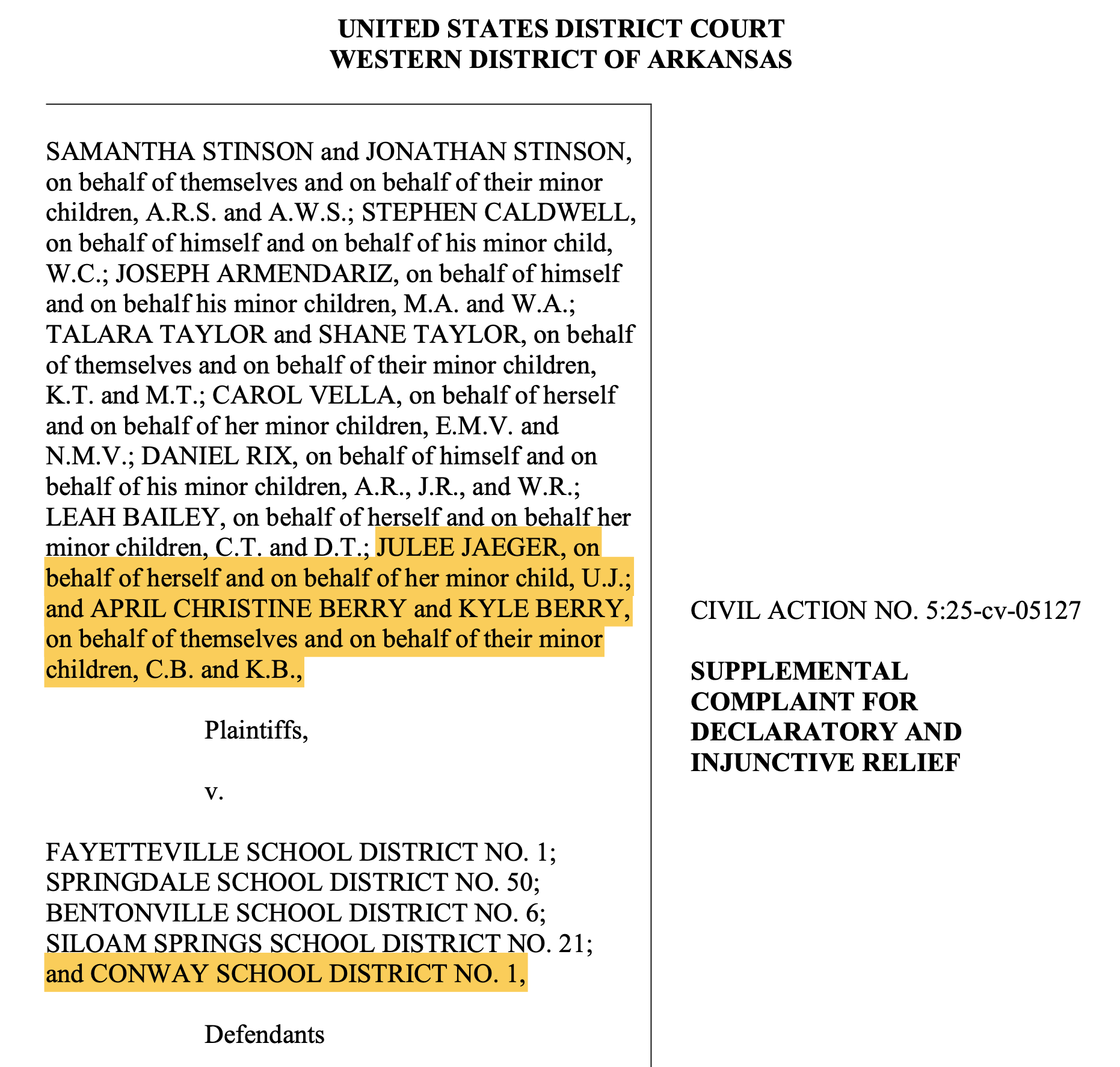 Over the course of the past week, the church/state groups asked the judge if they could amend their lawsuit to include two new Plaintiffs and the Conway School District as a Defendant. While you can’t normally modify Plaintiffs and Defendants in the middle of a case, the groups argued they had good reason for this: Their new clients didn’t realize the district was going to violate the law until their kids began the school year and saw the Christian signs. (They asked the district to remove the posters, but administrators refused.)
