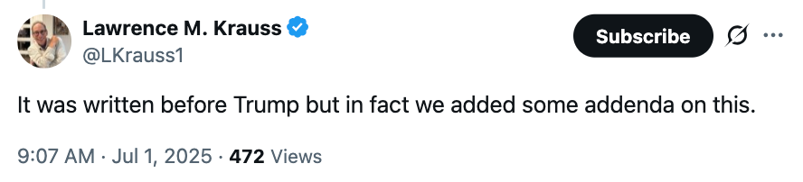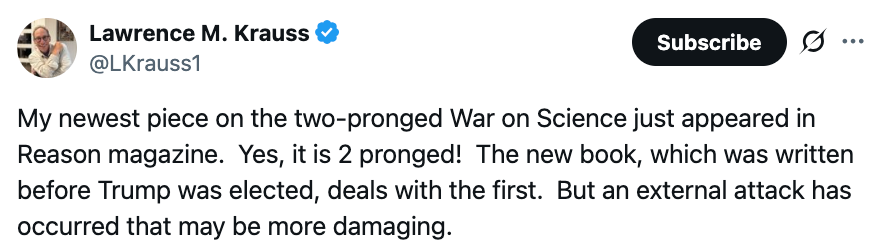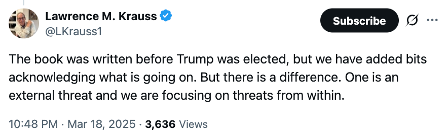 Instead, by pretending that the greatest threat to science comes from progressive inclusion rather than authoritarian arson, Krauss and his allies have given cover to those who would dismantle our research institutions. They’re compiling propaganda for those who want to bury science under the weight of their own ignorance. They are enablers who fiddle with culture war nonsense while the laboratories burn.