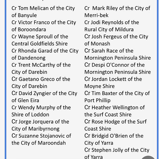 Open Letter to the Premier, Minister for Local Government, Minister for Multicultural Affairs, the Victorian Equal Opportunity and Human Rights Commissioner, the CEO and Board of the Municipal Association of Victoria, and the CEO and Board of the Victorian Local Governance Association