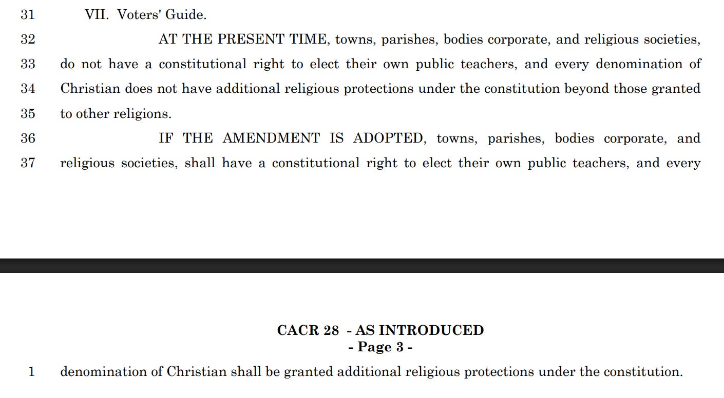 IF THE AMENDMENT IS ADOPTED, towns, parishes, bodies corporate, and religious societies, shall have a constitutional right to elect their own public teachers, and every denomination of Christian shall be granted additional religious protections under the constitution.