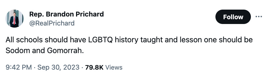 On Saturday, Prichard said that all schools should teach LGBTQ history and that “lesson one should be Sodom and Gomorrah,” referencing the story in Genesis 19 in which God uses fire and brimstone to destroy those cities on account of their wickedness. (Conservatives usually argue the wickedness involved sodomy, though it could also be argued that the sin was not being hospitable to strangers.)