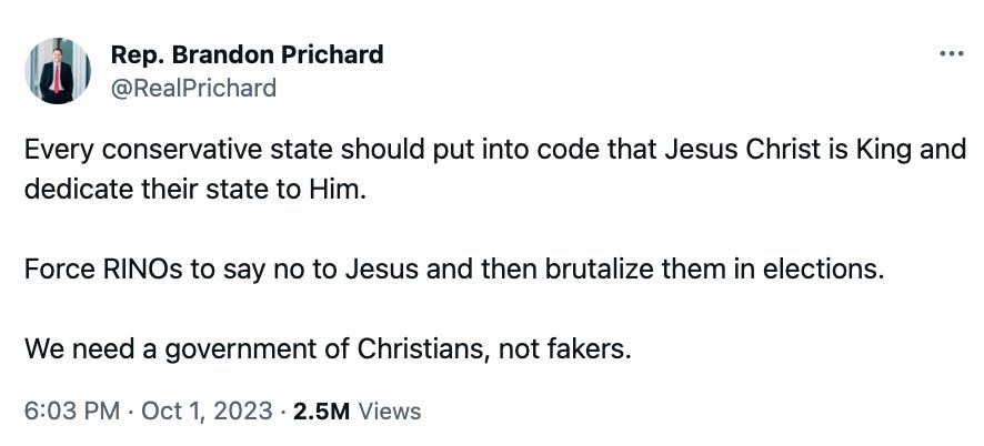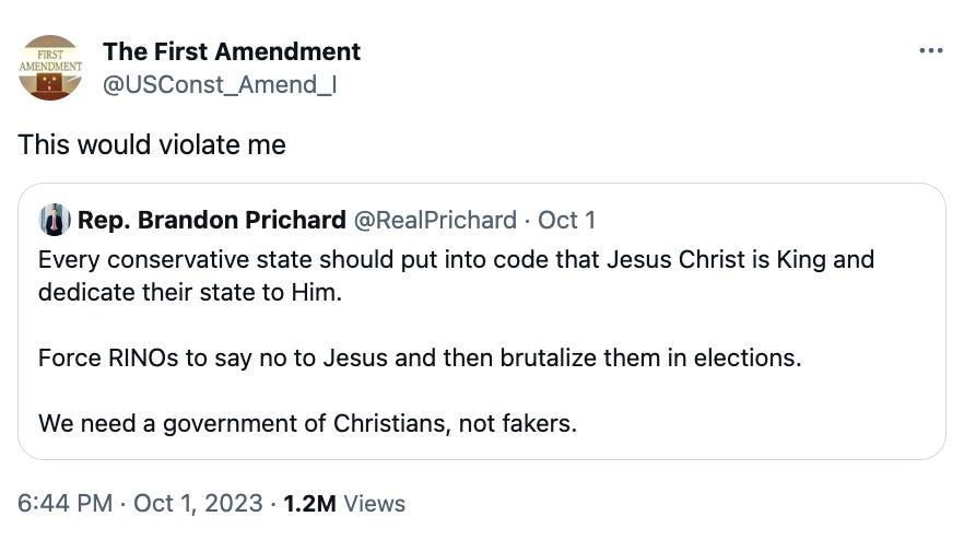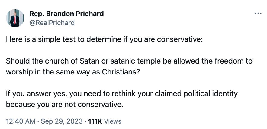 That was one of several tweets Prichard made in support of a government run entirely by and for conservative Christians. For example, he said True Conservatives™ should oppose religious freedom if it extended to groups like the Church of Satan: