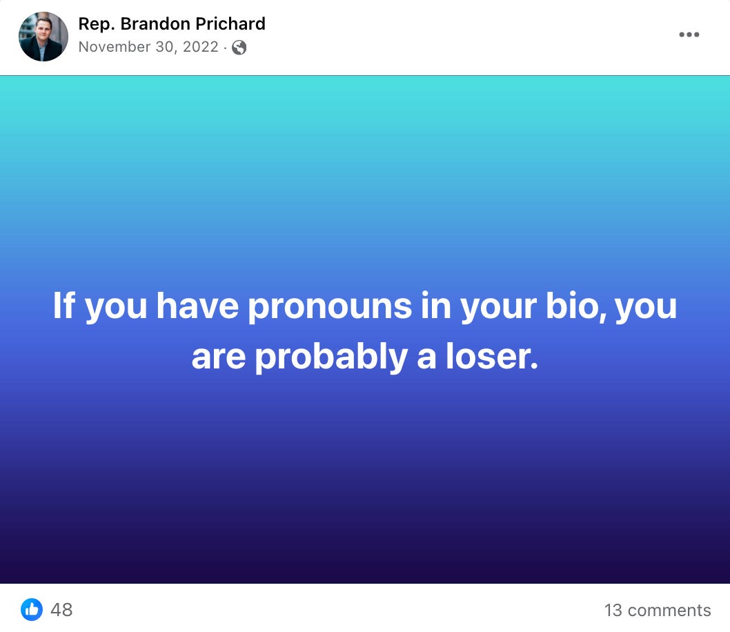 These are the kind of “leaders” that the GOP is going to continue to produce based off of the type of conservative voices that are popular. This moron probably listened to the likes of Shapiro, Kirk, Tate, etc. and assumed that that is just how the world works. He’s an immature man child who has no concept of what government employees should actually be doing so he feeds off of reactionary garbage like this. He wants the attention so that when he does inevitably get reprimanded for these things he can cry about being silenced.