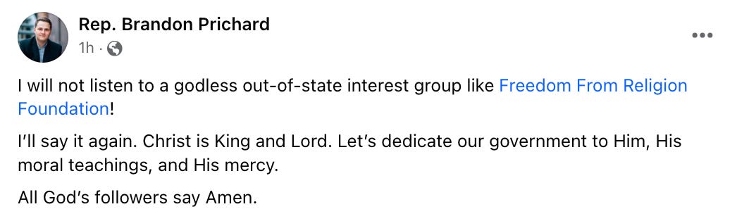 Note how he completely ignores the substance of the group’s letter. The fact that he dismisses FFRF as an “out-of-state” group is a sign of desperation because it’s not like Prichard listens to in-state critics either. If he ever studied history or law, though, he would understand just how batshit crazy and un-American his political theories are.
