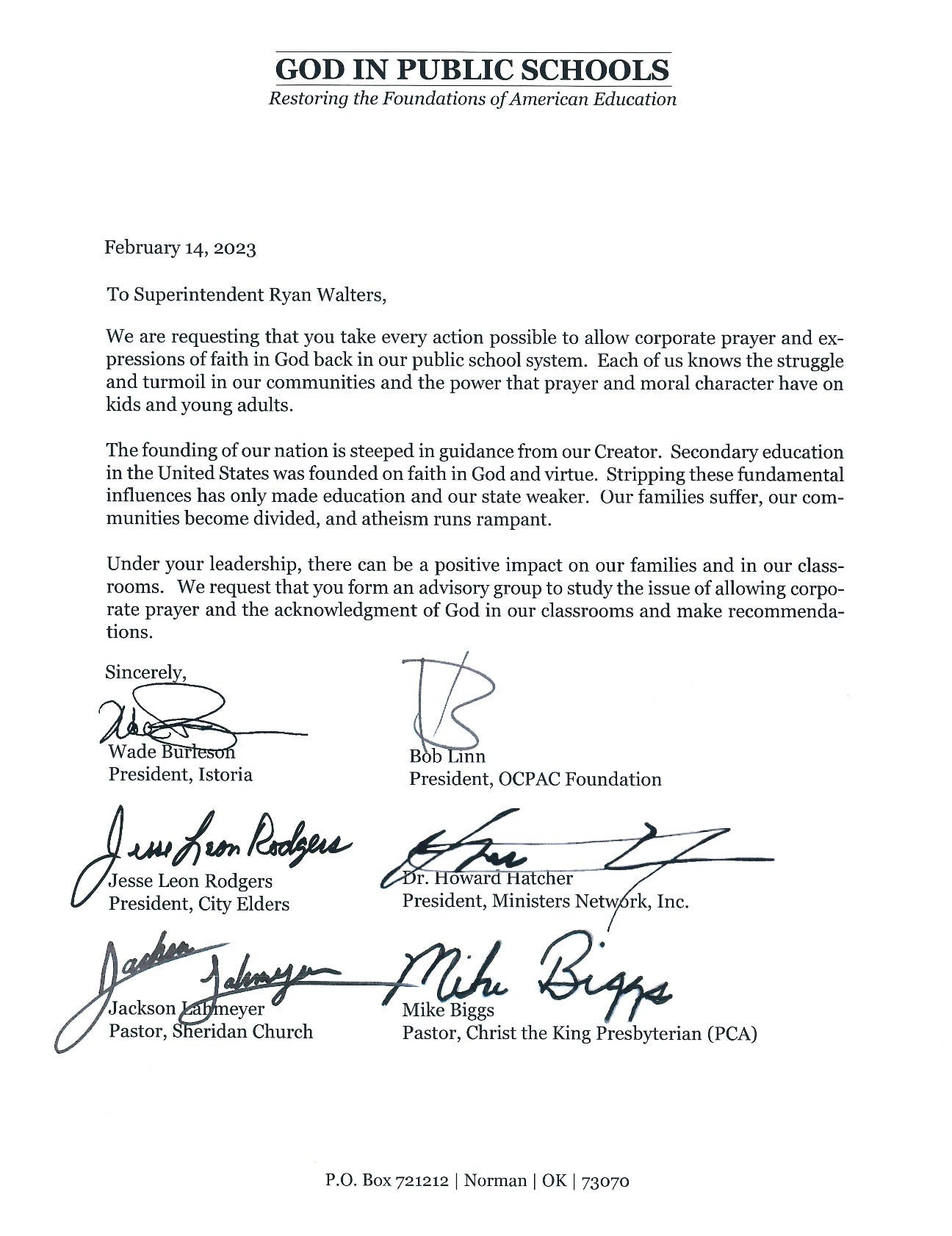 We are requesting that you take every action possible to allow corporate prayer and expressions of faith in God back in our public school system. Each of us knows the struggle and turmoil in our communities and the power that prayer and moral character have on kids and young adults.
