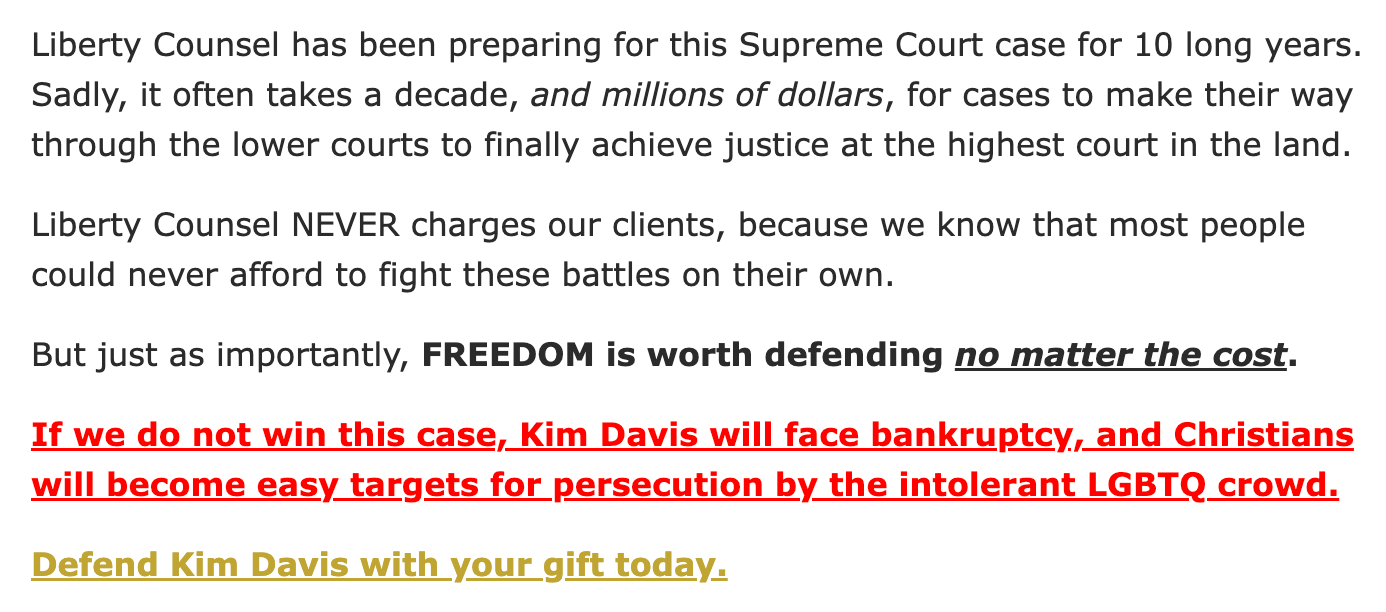 If we do not win this case, Kim Davis will face bankruptcy, and Christians will become easy targets for persecution by the intolerant LGBTQ crowd.