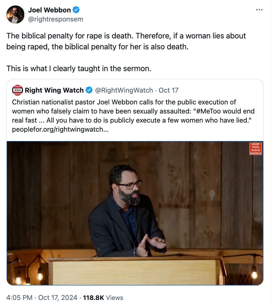 After Right Wing Watch shared that clip, Webbon responded by basically saying, Yeah, that’s exactly what I meant: “The biblical penalty for rape is death. Therefore, if a woman lies about being raped, the biblical penalty for her is also death.”