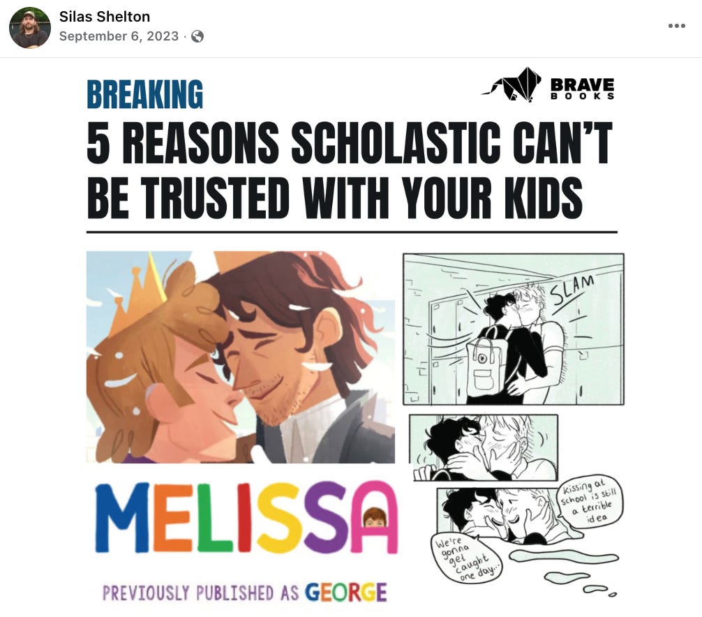 He also told a local news affiliate he was concerned about all the “sexual innuendo” in the books. And he proudly posted graphics on Facebook about why “Scholastic can’t be trusted with your kids.”