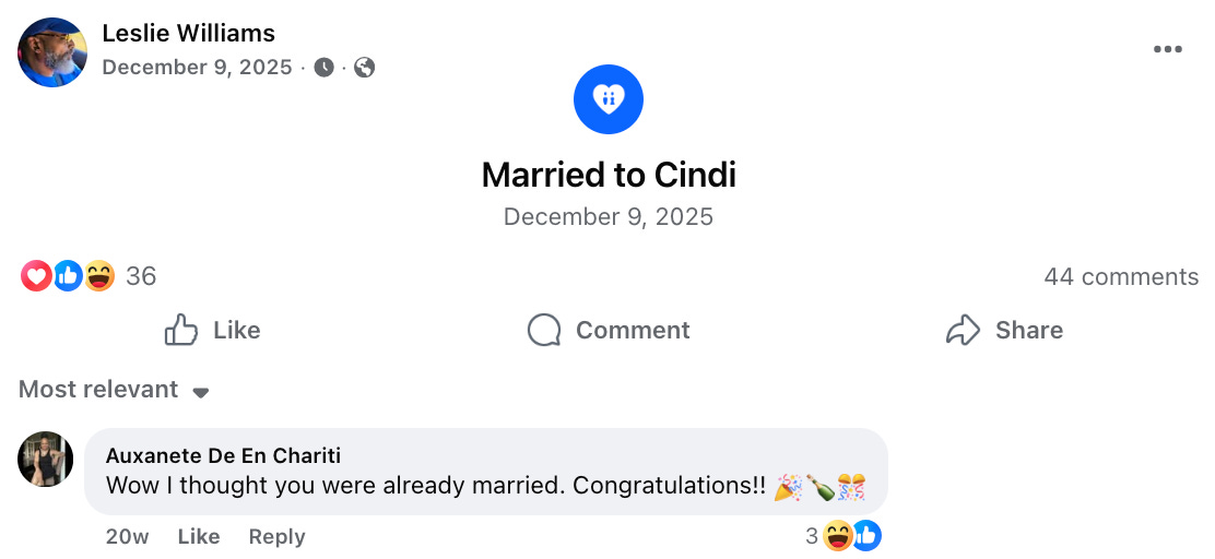 It’s not clear how people realized he actually had more than one wife, but it probably didn’t help that he recently posted about getting married on Facebook, only to have someone chime in with “Wow I thought you were already married. Congratulations!!”