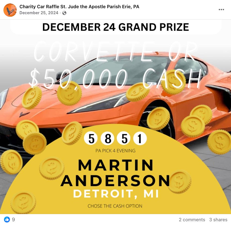 The Grand Prize winner last year was Martin Anderson from Detroit, which the church revealed on Christmas Day. Their Facebook post also noted that Anderson “chose the cash option” instead of the car.