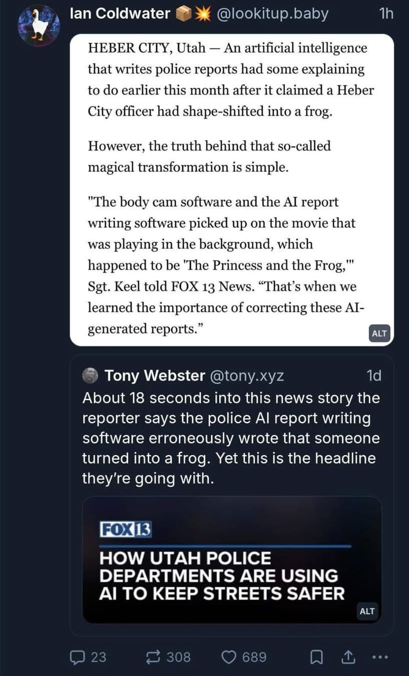 The combination of police misconduct and AI hallucination has to be one of the most low-key terrifying things to come out of that shitty technology. If you thought the problem of cops planting evidence was bad already, just wait until they hit on the idea of using AI to manufacture video "evidence." If it hasn't happened yet, it will.