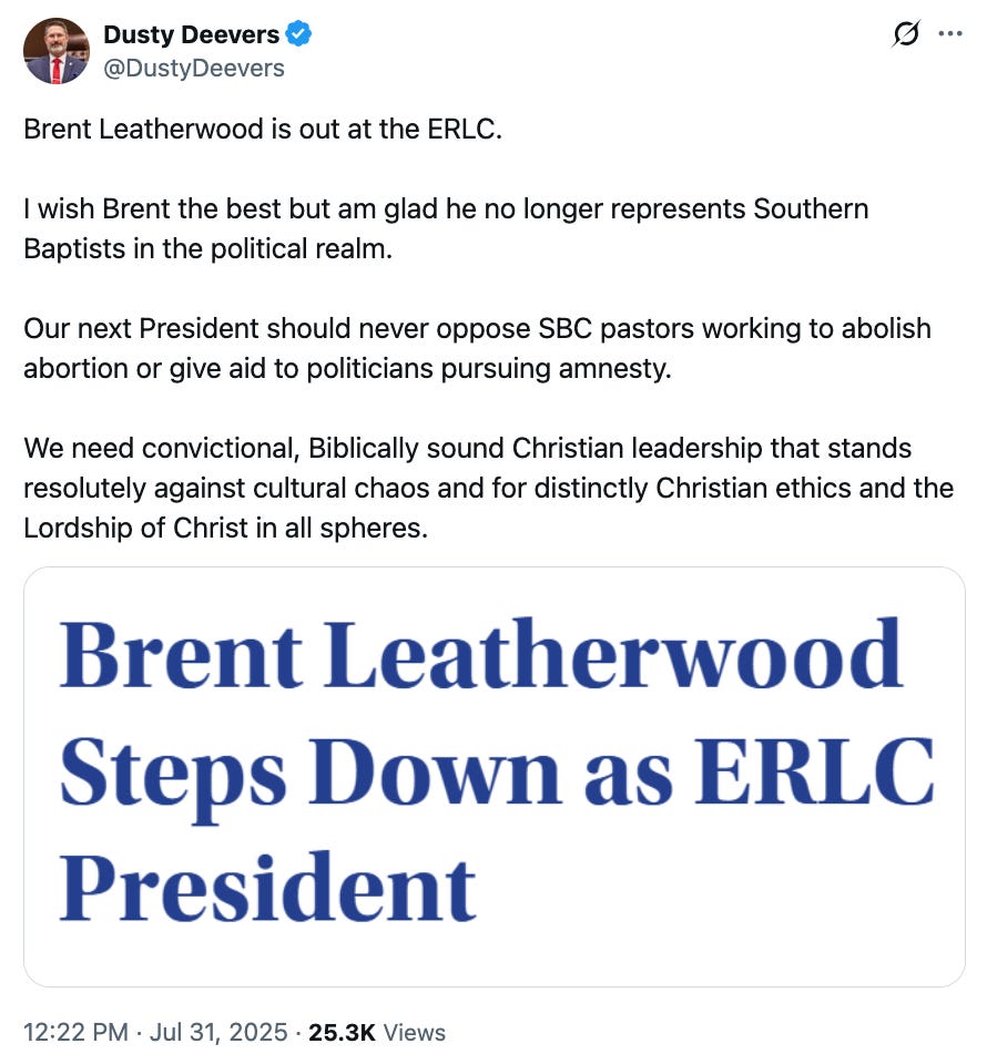 Last week, Brent Leatherwood, president of the SBC’s Ethics and Religious Liberty Commission, resigned after years of criticism, primarily from right-wing MAGA cultists who argued he wasn’t doing enough to promote Trump’s agenda. At the SBC’s annual meeting in June, nearly half of the delegates (43%) voted to abolish the ERLC entirely. It wasn’t a majority, but the writing was on the wall.