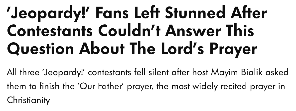 In some ways, it’s understandable that people would be surprised by this. The Lord’s Prayer is arguably the most famous Christian prayer, and there’s a reason it was the lowest-valued clue in the category: Even the show’s writers expected the contestants would know it.