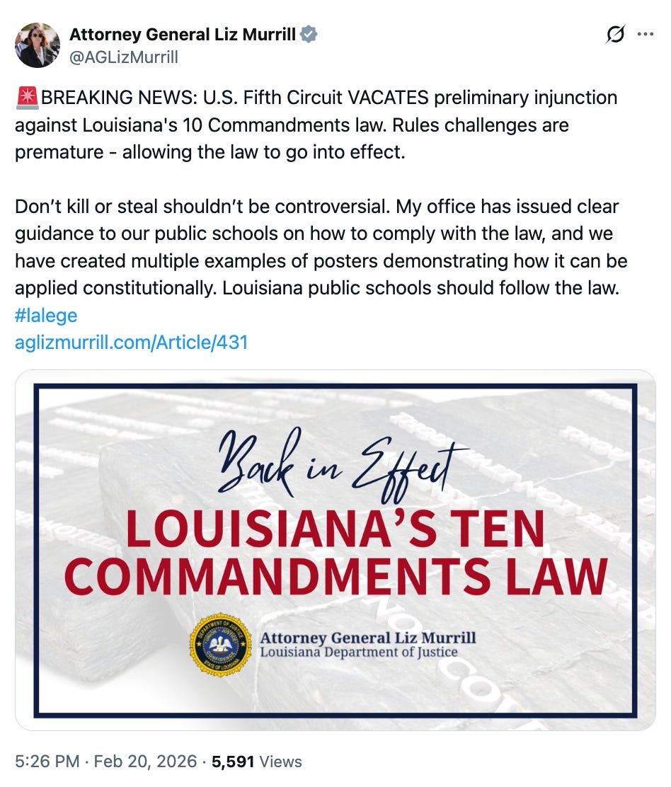 What makes this ruling so annoying is that the Fifth Circuit isn’t grappling with a difficult constitutional question; it’s avoiding one. The judges know exactly what Louisiana intends to do because Louisiana told them. There’s nothing speculative about forcing a religious document onto classroom walls. By declaring the case not “ripe,” the Fifth Circuit has insulated a plainly unconstitutional law long enough for it to cause real harm. Families who already know their rights are being violated must now wait until their children are subjected to state-sponsored religious messaging before they can seek relief. That’s not how constitutional protections are supposed to work. The First Amendment exists to prevent violations, not to require victims to endure them first so courts can acknowledge the obvious.