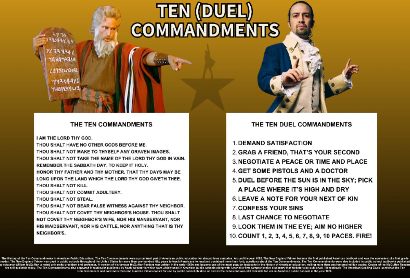 Another sample poster compared the Ten Commandments to the Ten Duel Commandments from Hamilton: