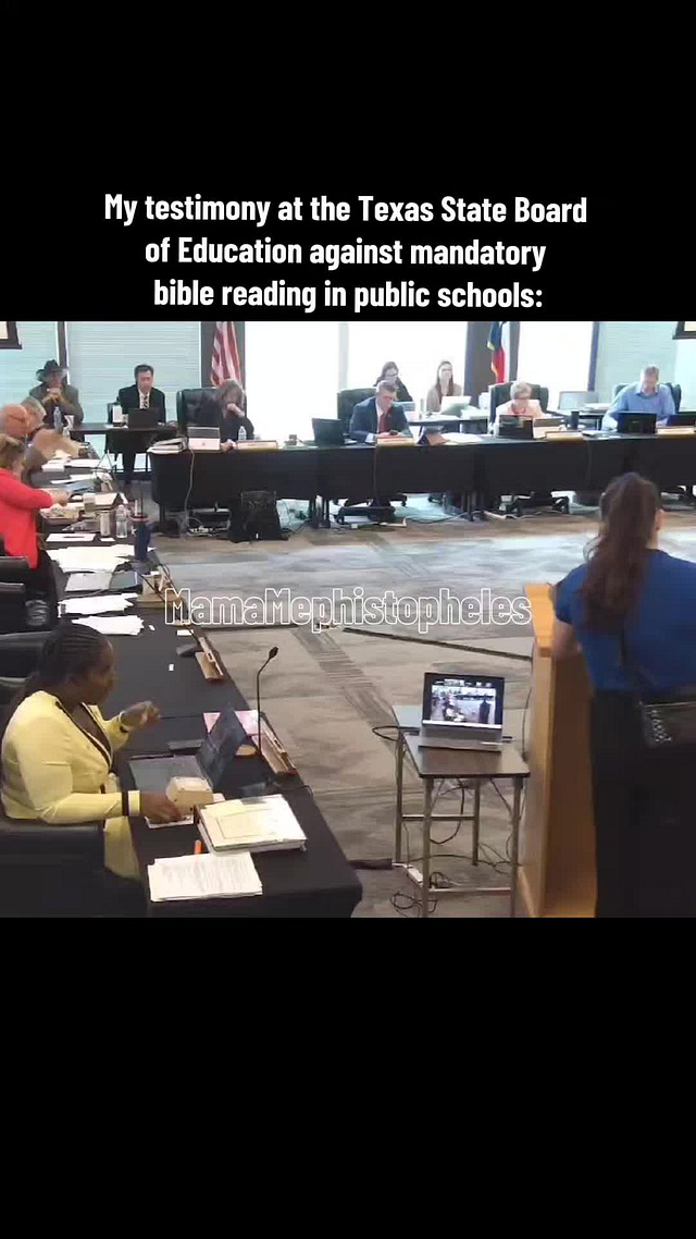 Miller told me yesterday that she’s received “mostly positive” feedback from her statement and the viral video. While other speakers focused on the unconstitutionality of the list or the logistical impossibility of getting through the list in a school year, she wanted to focus on the Christian Nationalism of it all.