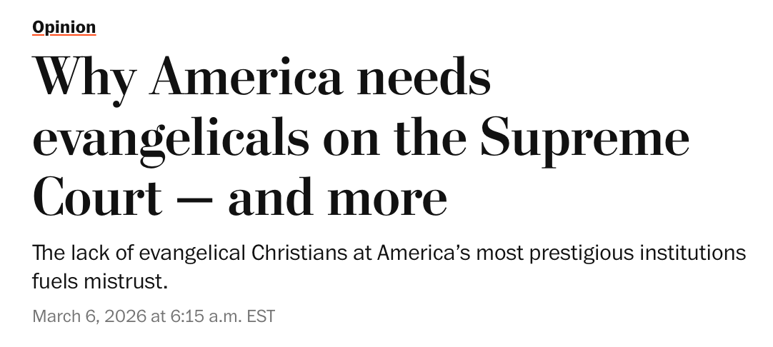 … Increasing the evangelical presence in boardrooms, elite universities and high courts would not only give those institutions access to a large pool of talent. It would also help restore trust in American institutions and ensure that they really do represent America in all its diversity.