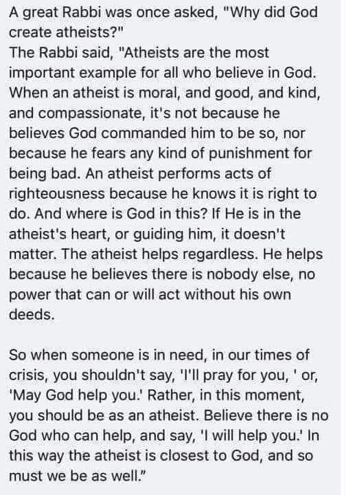 Yeah, told the story before but – friend of mine was teaching physics and a high school and they were talking about something I forget what, one of the kids said "Ah but he is an atheist." And this fundamentalist girl came up to him afterwards and said "But, but – you're nice!"