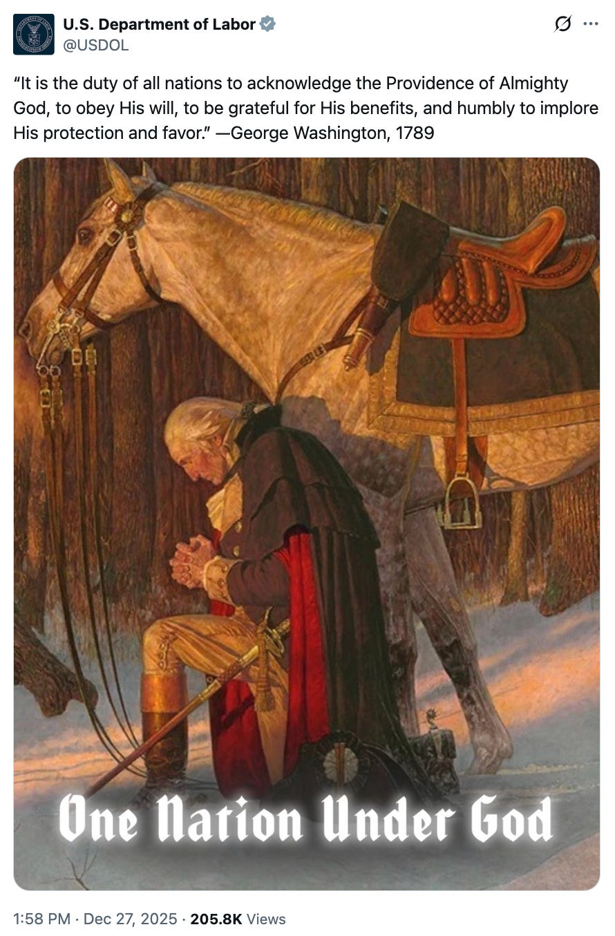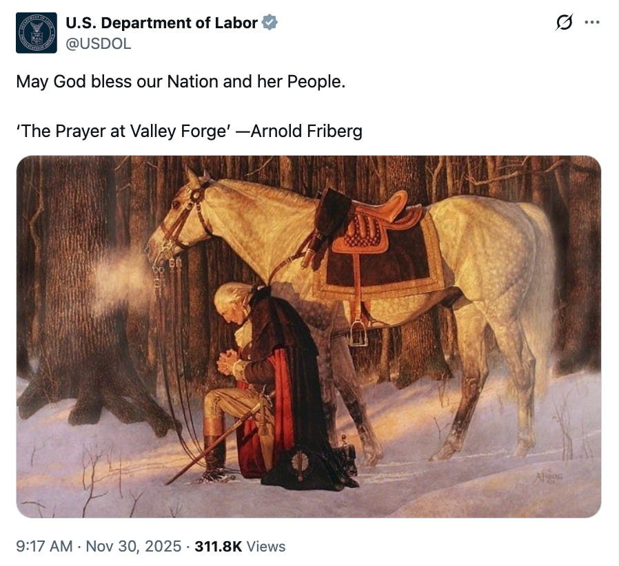 On Saturday, the U.S. Department of Labor posted the following image featuring George Washington honoring the Christian God.