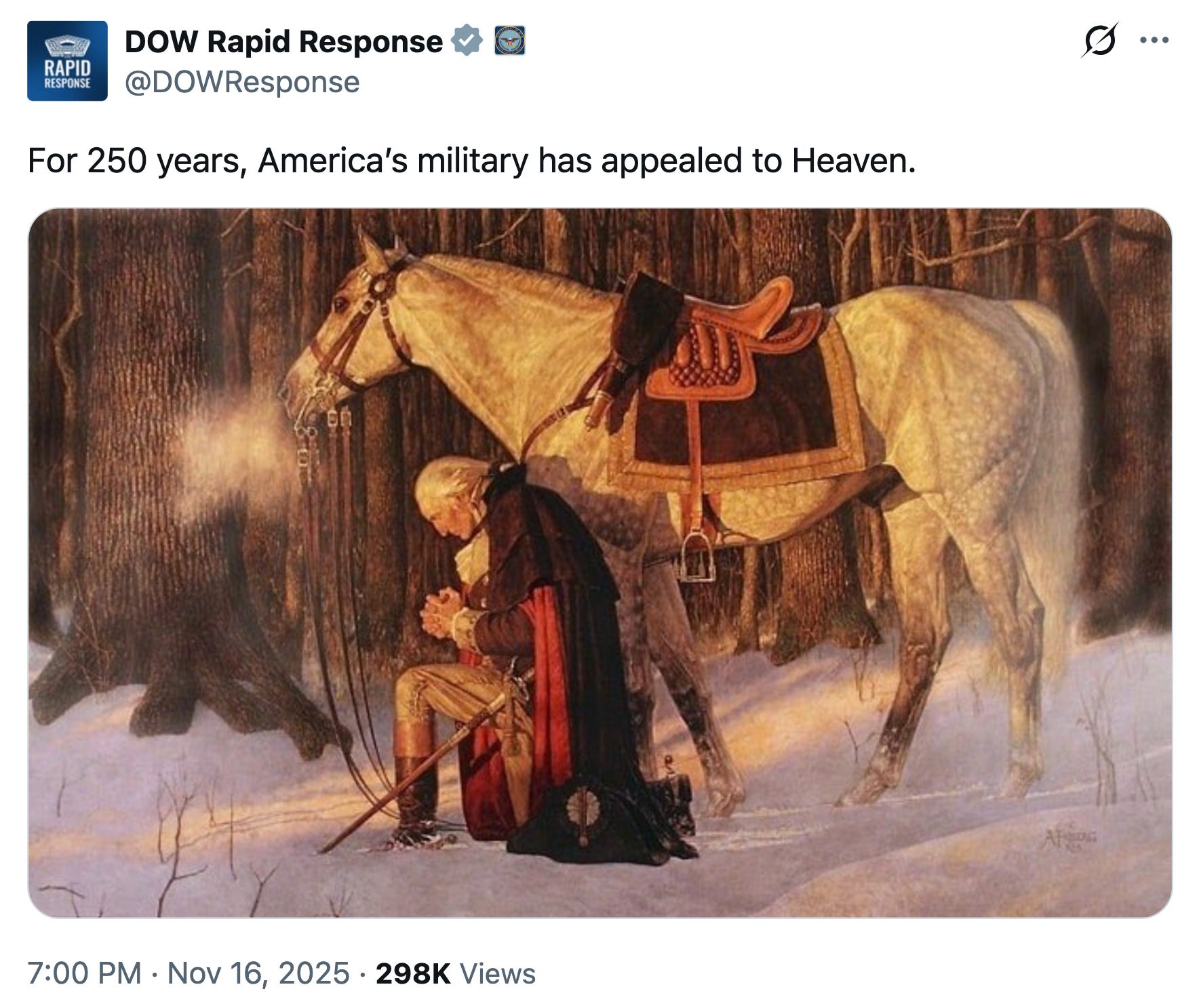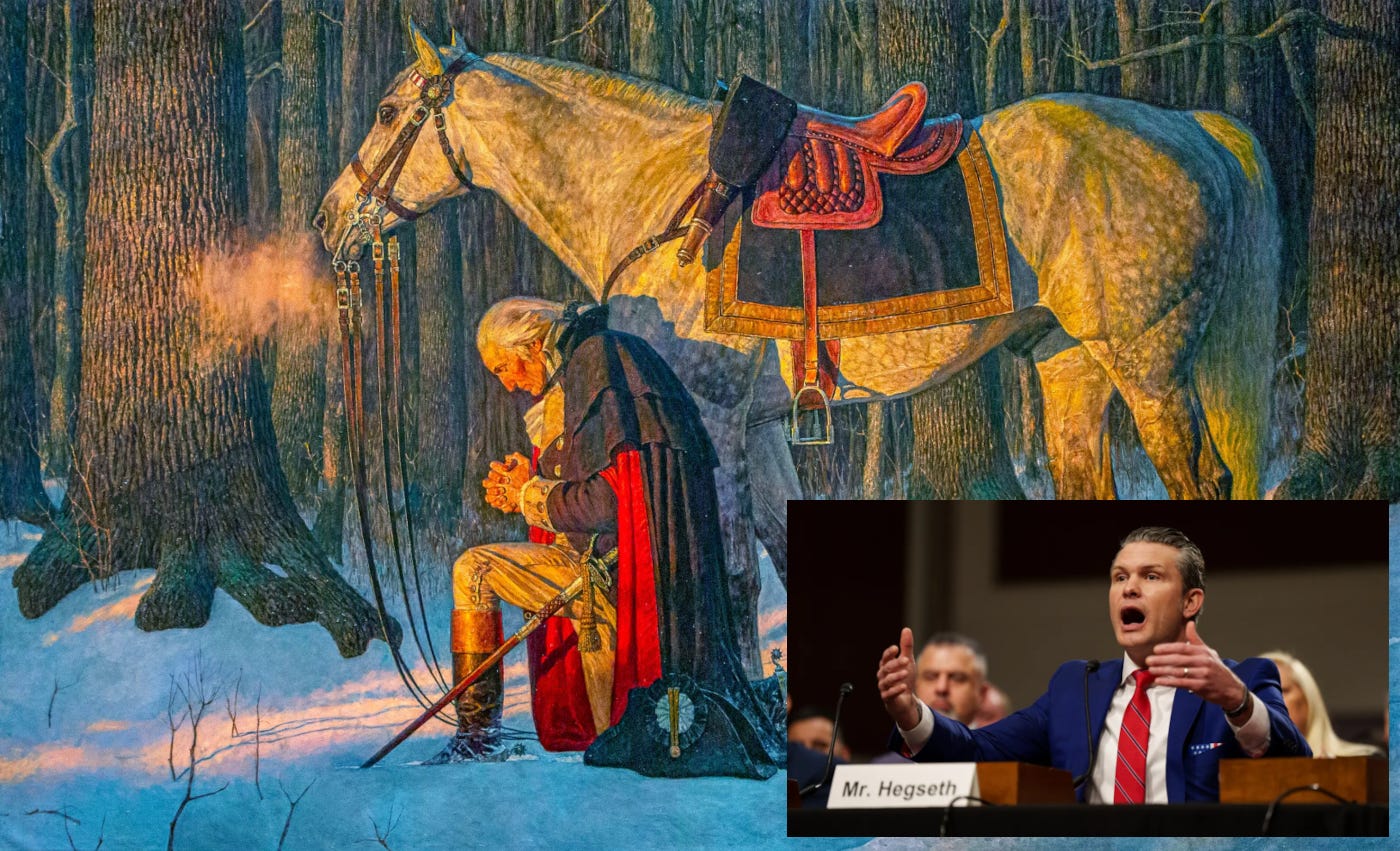 When Hegseth spoke at the Pentagon’s “Christmas Worship Service” on December 17, he insisted regular Christian prayer sessions would continue because “as George Washington did that first year, he went on bended knee for providence in impossible tasks.”